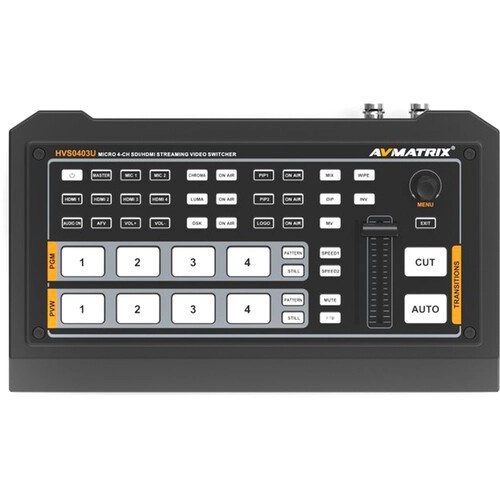 Add professional video switching and audio mixing flexibility to your concert productions, house of worship, educational forum, or live sports programming with this HVS0403U Micro 4-Channel SDI & HDMI Video Switcher from AVMATRIX. Boasting two HDMI and two SDI autodetected inputs, the HVS0403U is a compact and user-friendly video switcher loaded with powerful features, including luma and chroma keying, mix/fade/wipe effects, audio mixing, and a picture-in-picture (PiP) or picture-on-picture (PoP) layout, using tactile functions such as auto and cut transitions or with the T-bar.
