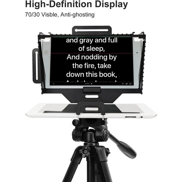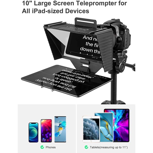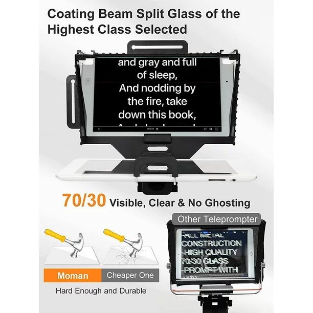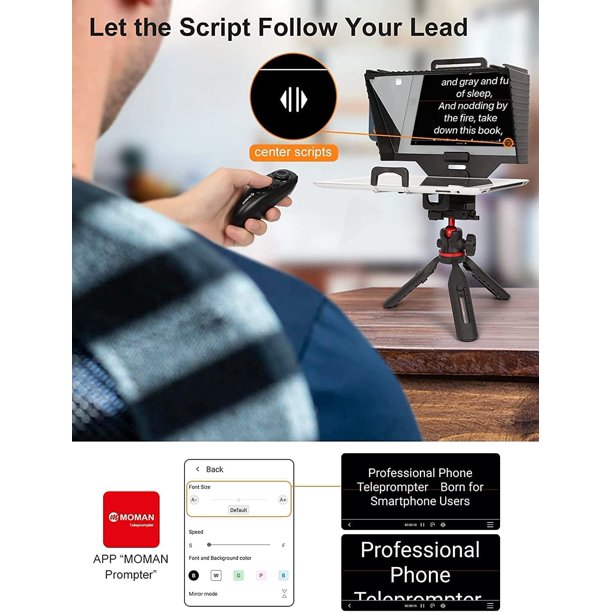 | 【10″ Large Screen Teleprompter for All iPad-sized Devices】To create an immersive reading experience, help speakers’ eyes keep focusing on the lens and deliver one more natural recording, MOMAN MT2 ipad teleprompter employs a full-frame rectangle 10” screen and supports phones & tablets(measuring up to 11”), offering an ultra-wide visual range for video creators. 【Let the Script Follow Your Lead】The iOS/Android “MOMAN Prompter” APP supports to center scripts, edit font size, change background color and automatically adapt to system languages. With one wireless remote, you could adjust the scrolling scripts of the teleprompter for tablet: start, pause, speed up, slow down at any time. 【Vlogging Tripod Gift Set for You】The teleprompters MT2 comes with a vlogging tripod kit inbuilt with one 360°adjustable ball head with 1/4” thread to attach teleprompter, and one smartphone clamp for any kinds of smartphones. Moreover, you could make it as one handheld grip for one on-the-go shooting. 【Functional Kit for Demanding Applications】Moman Teleprompter MT2 supports smartphones/DSLR cameras vertical and horizontal shooting (the lens needs to be adjusted to prevent vignetting). 2 cold shoe tracks on the top allow to mount photography fill light and microphone, ideal for TikTok, interviews, KOL programs and more demanding occasions. 【Coating Beam Splitter Glass of the Highest Class Selected】To deliver the most clear display text and contribute to recording a high-definition video, Moman MT2 ipad teleprompter employs 70/30 beam splitter glass with excellent light reflection and light transmittance, 8pcs lens adapters(49,52,55,58,62,67,72,77mm) for camera and 6-type foam rings for smartphone to prevent any sneaking light, flaring or ghosting. |